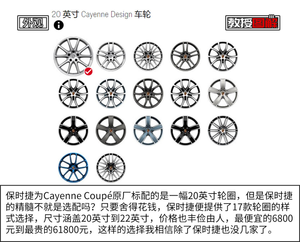 SUV这一类车型一向是世界各大汽车厂商重视的市场,近些年来各大豪华品牌甚至是超跑品牌都推出了SUV车型来抢占市场。这里面的佼佼者除了奔驰宝马外,不得不提保时捷。而这几家厂商在SUV市场逐渐一致化的时候率先进行了细分转变,宝马X6的横空出世带领各大厂商推出轿跑型SUV,奔驰也紧随步伐推出了各级别轿跑型SUV,保时捷则似乎有些保时捷终于去年跟上了步伐,推出了Cayenne Coupé 轿跑型SUV。当保时捷终于开始从看似“不务正业”的SUV中尝试“回归正道”,会有什么样的表现?本次我们选取了起售价为99.8万元的Cayenne Coupé进行图解,一同看看这样的保时捷有什么不同。